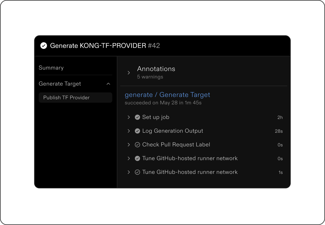 "Thanks to Speakeasy's platform, the cost of offering a Terraform provider for Kong went from two engineers and 12 months to 'just sign off on this purchase order.' I was able to build the provider in between meetings."